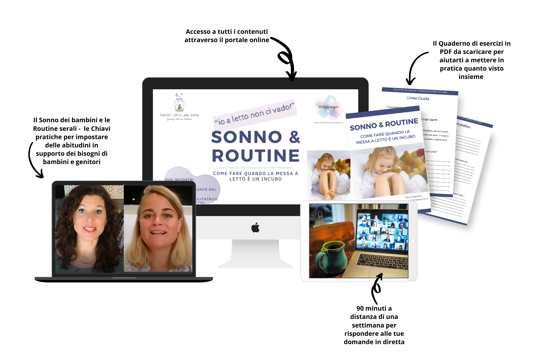 Due registrazioni di 90 minuti ciascuno con Anna Solé, consulente del sonno, e Clio Franconi, facilitatrice in disciplina positiva, in cui imparerai: